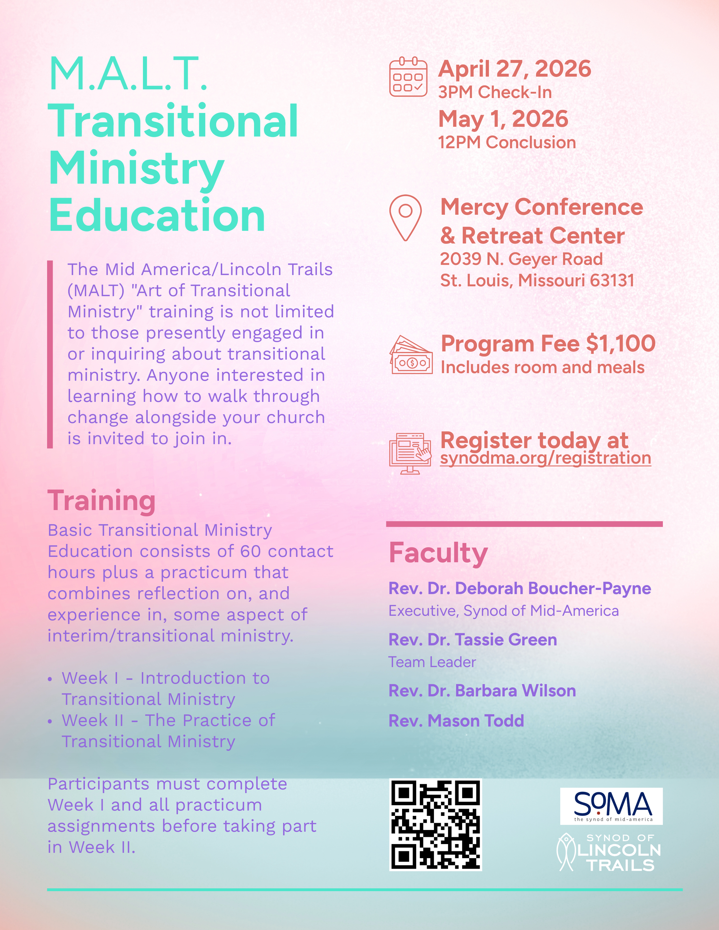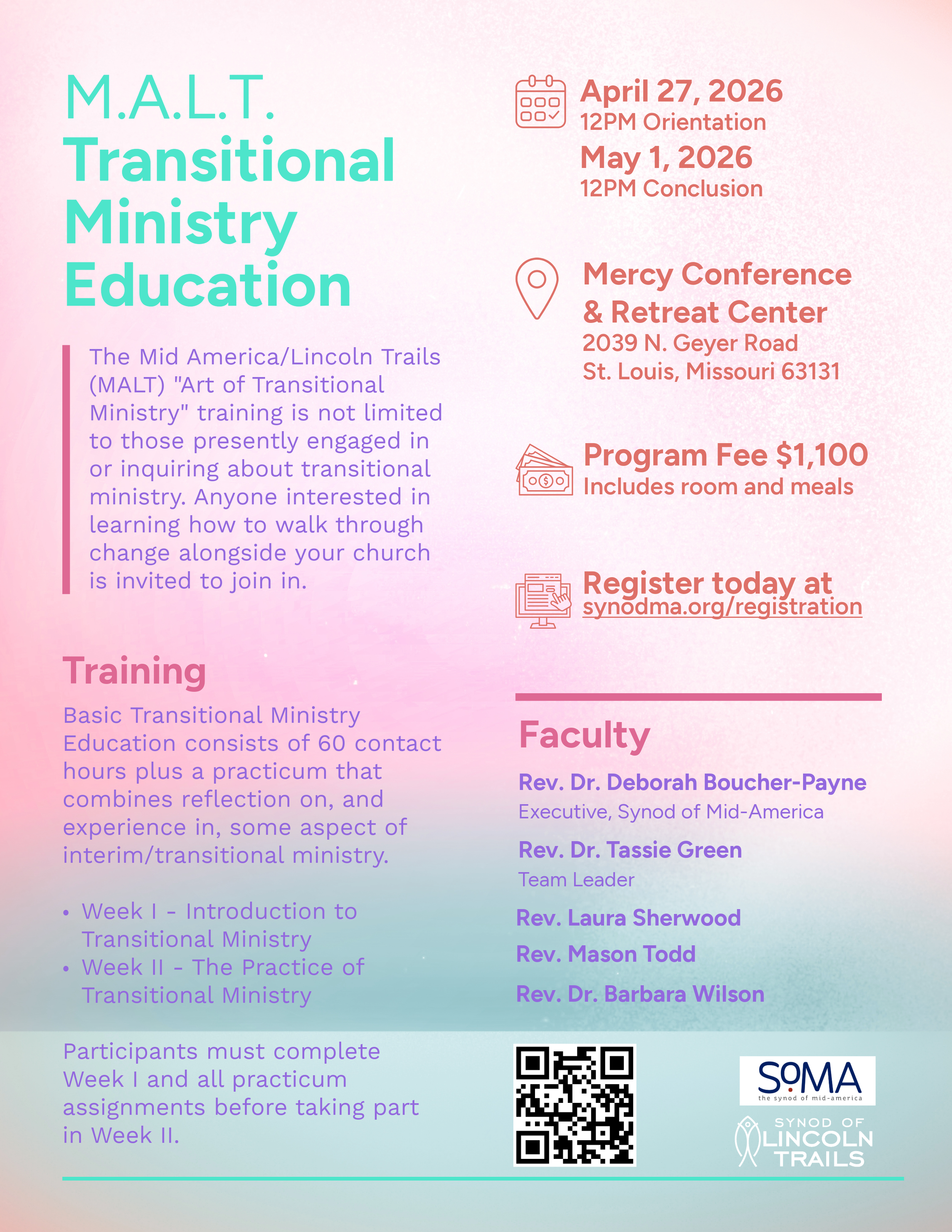 The Mid America/Lincoln Trails (MALT) "Art of Transitional Ministry" training offers education for both Weeks I & II. Participants must complete both Residency Week I and all practicum assignments before taking part in Residency Week II. Those who complete the first week of basic education at another site must complete all MALT practicum assignments prior to attending Residency Week II.